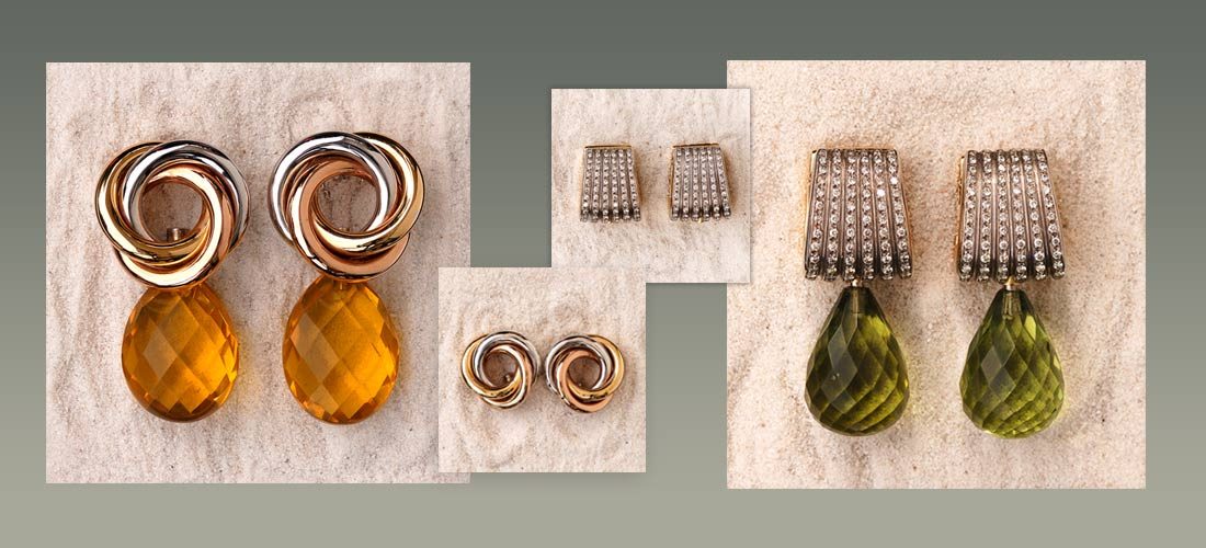 Damit viele Frauen zu unterschiedlichen Anlässen, Stimmungen, Tageszeiten veränderbare Ohrschmuckstücke tragen können, haben wir uns immer wieder verschiedene Möglichkeiten der Verwandlung ausgedacht. Alles mit individuellen Ohrschmuckoberteilen, einzelnen Pärchen aus verschiedenen Epochen, die verziert werden mit auswechselbaren Perlen, Onyxtropfen, Bergkristallpampeln, facettierten, grünen Bernsteinpampeln und vielem mehr.